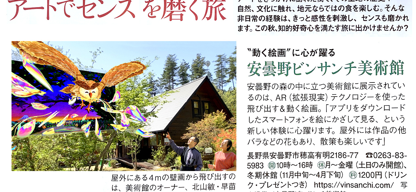 旅の地は、安曇野 弘前 金沢 葉山 嵯峨・嵐山 倉敷 瀬戸内で、旅のトップに「安曇野ビンサンチ美術館」が載っていますので、お買い求めてご覧ください。「金沢21世紀美術館」「倉敷 大原美術館」「瀬戸内 地中美術館」などの最新情報もチェックできます。