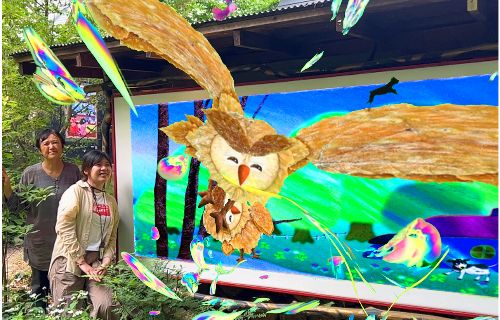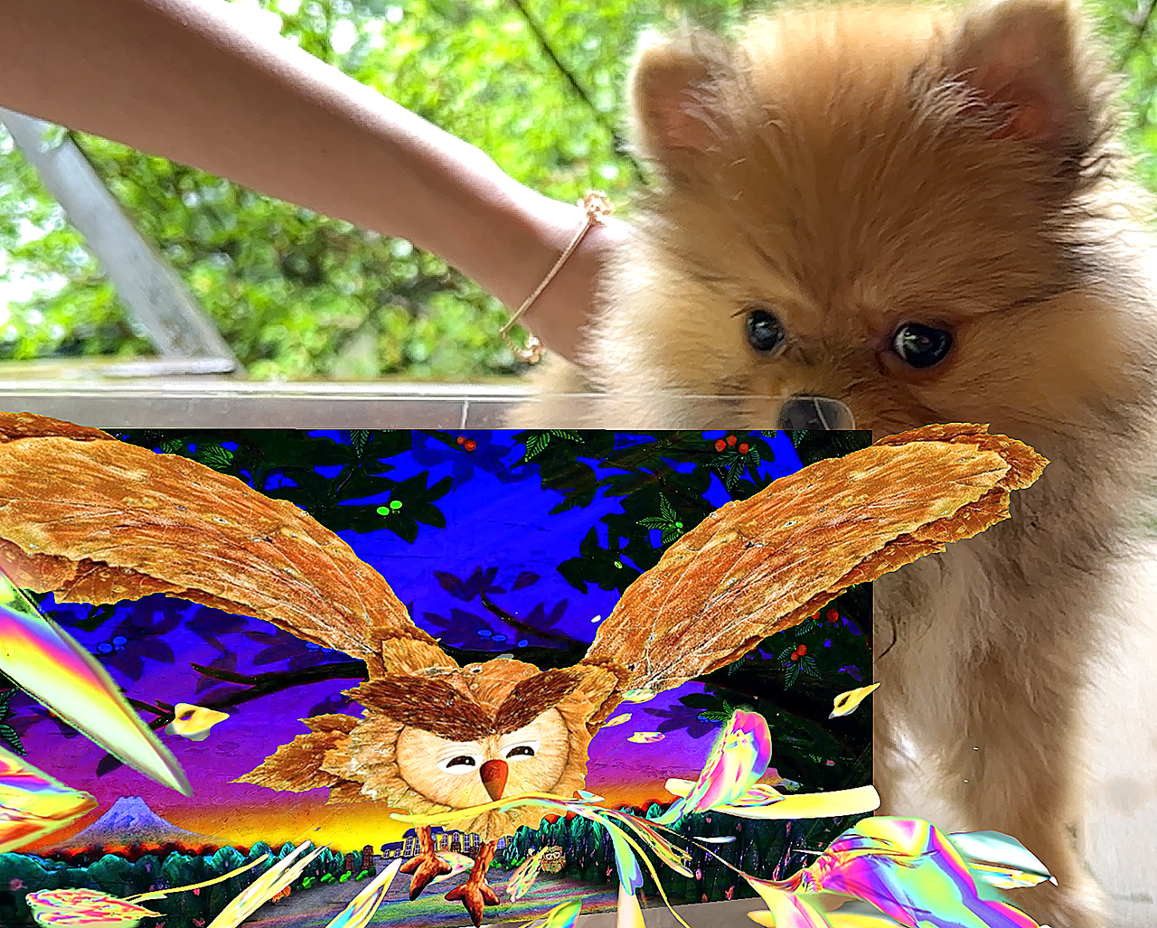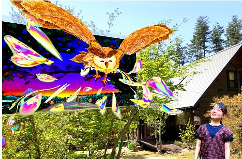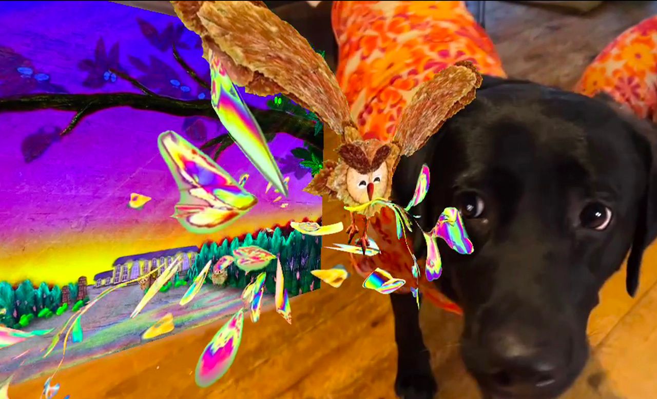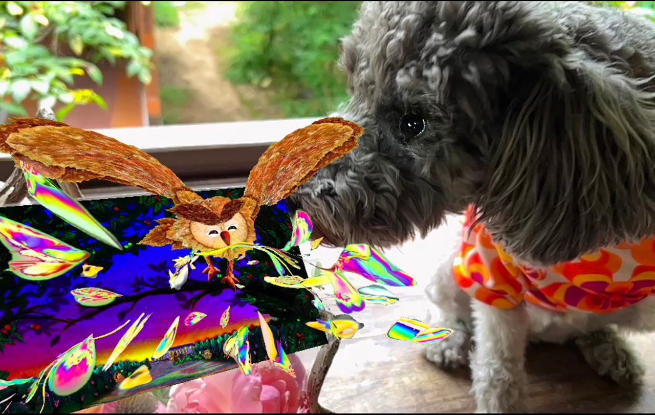 作品の前に立ってスマホをかざすと、ふくろうがミクロの光とともに飛び出す画像が見られたり、犬のロゼ(人形)が踊ったりします。